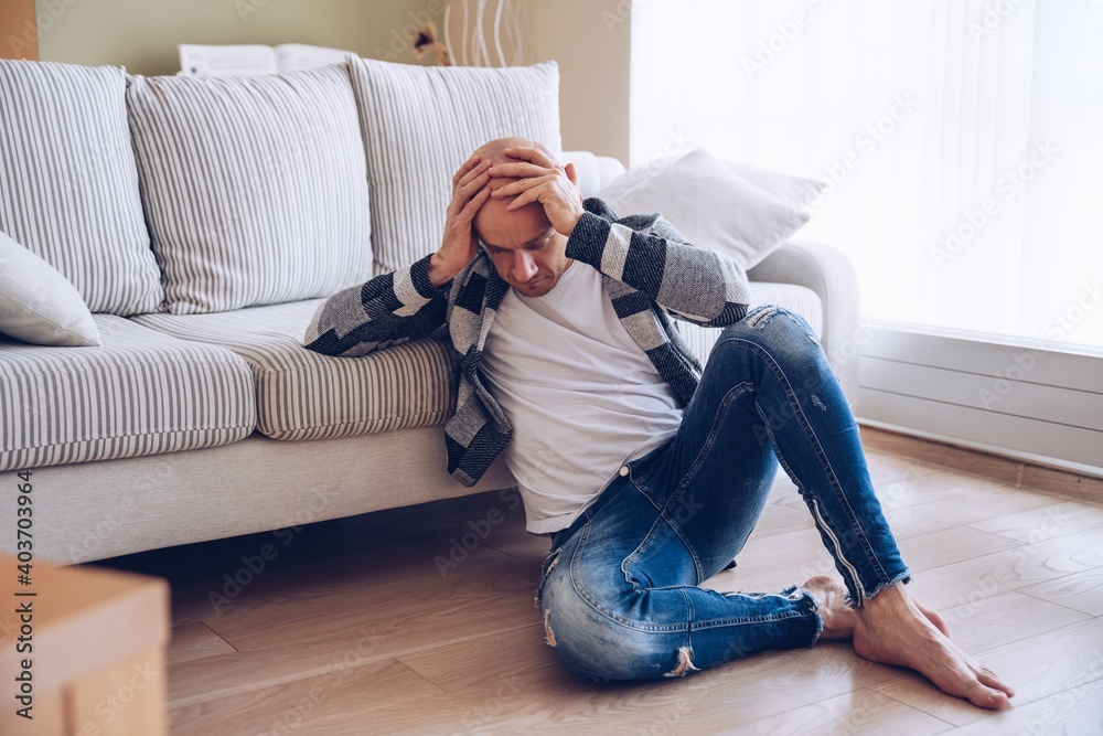 A worried man is sitting on the floor holding his head. Sorrow and regret.