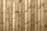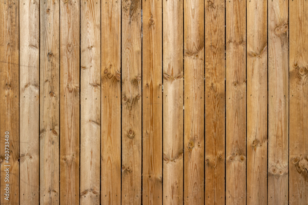Full frame texture background of a wooden fence with natural wood grain planks, in bright sunlight