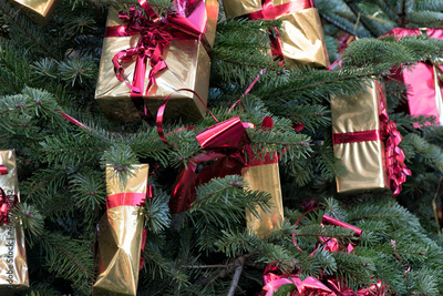 background of a close up of a Christmas tree decorated with tree gifts