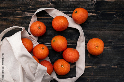 orange tangerine friuts tip out from white shopper bag on rustic wooden table surface