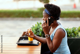 Cute African woman having lunch outdoors in city cafe. A girl is talking on the phone during lunch.