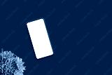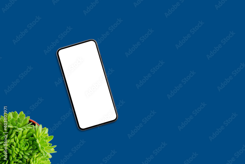 Phone on blue surface. Isolated screen for mockup, app design presentation. Plant and copy space beside
