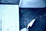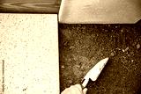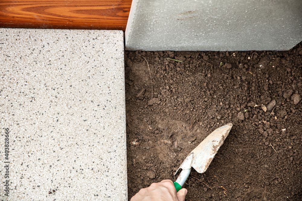 man is laying quadratic tiles in the garden