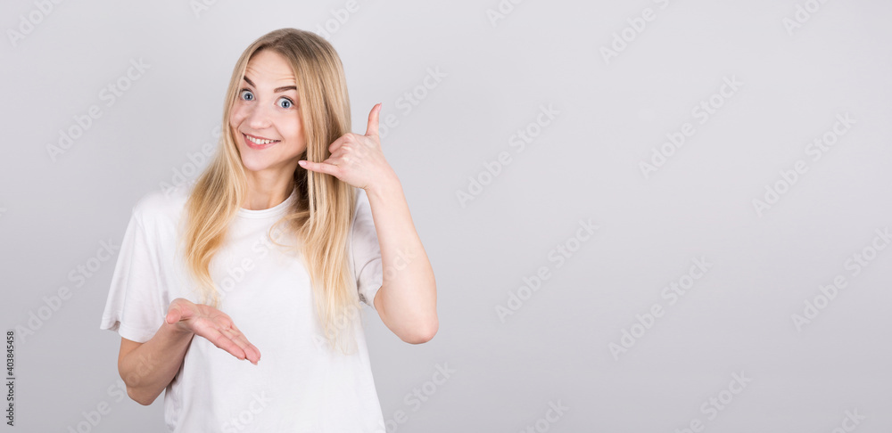 Young handsome woman smiling doing phone gesture with hand and fingers like talking on the telephone woth copyspace