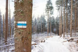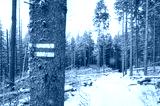 Hiking trail on a tree in snow covered Tatra mountains, Tatra National Park, Poland.