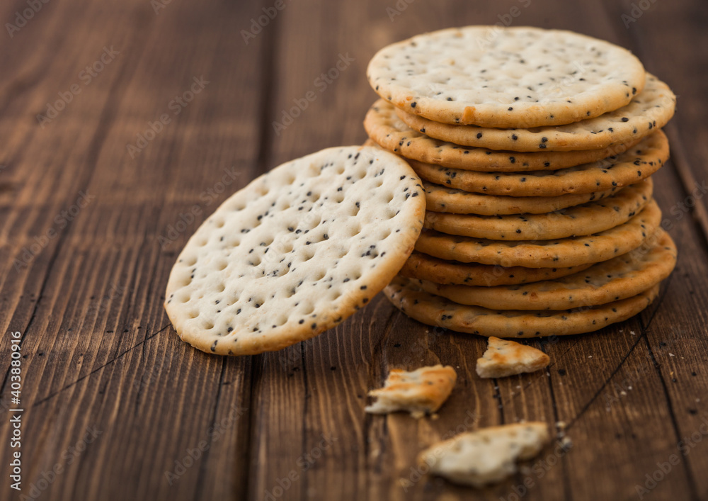 Stack of various organic crispy wheat flatbread crackers with sesame and salt on wooden background.