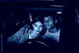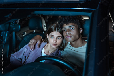 Keep calm and enjoy. Attractive young couple watching a movie while sitting together in the car parked in front of a big screen in an open air cinema