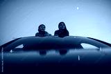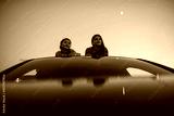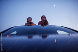 Its movie time. Two girls lying on the roof of a car with popcorn bags and drinks while watching a movie in an open air cinema in the evening
