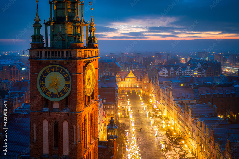 Beautiful clock of the town hall in Gdansk at night, Poland