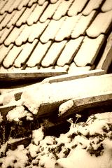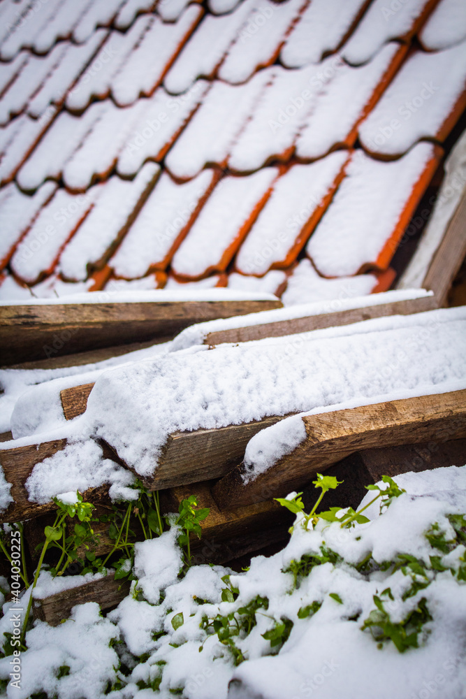 Wooden boards and beams in the background of the building with red tiles covered with snow