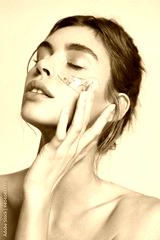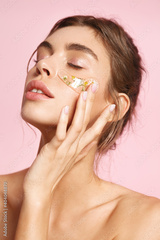 Skincare. Romantic woman apply under eye patches with active botanic ingredients chamomile, reduce dark circles and nourishes skin for better hydration, pink background
