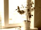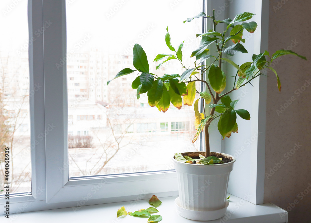 Plant in a pot on the windowsill inside the room. An unhealthy plant with yellowed and fallen leaves. Improper care, illness.