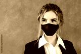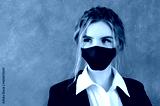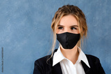 european blonde woman in black mask, white shirt and black jacket on gray background close-up, female portrait