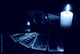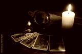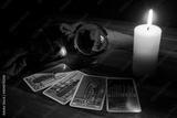concept of fortune-telling wooden table and white candle with a crystal ball and tarot cards on dark background