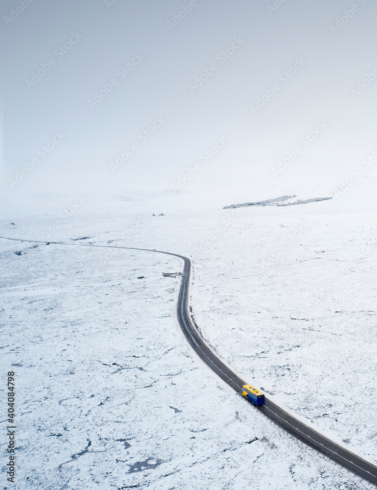 Aerial view of A82 road through Rannoch Moor and Black Mount covered in snow during winter
