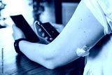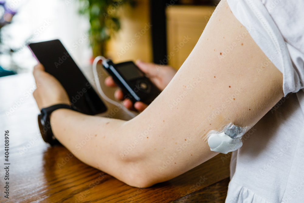 Modern diabetes treatment, woman checking glucose level and dosing insulin using insulin pump and remote sensor on her hand, focus on foreground