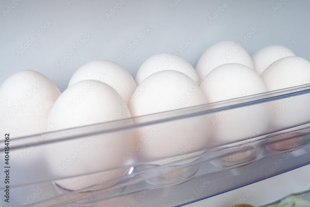 A lot of white hen chicken eggs on a shelf of a fridge, protein source for health, ingredients for fast breakfast for dieting, slimming and sports person