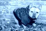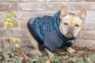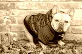 Fashionable Frenchie Standing in front of Brick Wall and Looking at Camera.