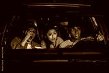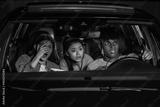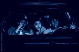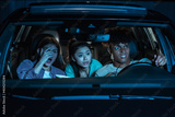 Portrait of three young friends looking emotional while sitting together in the car and watching a movie in a drive in cinema
