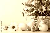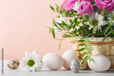 Composition with eggs and basket of flowers on peach background. Copy space.