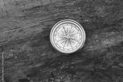 Classic navigation compass on natural background as symbol of tourism with compass, travel with compass and outdoor activities with compass