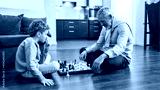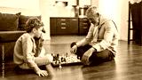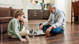 Grandfather and his little grandson playing chess, enjoying game while sitting on the wooden floor at home