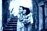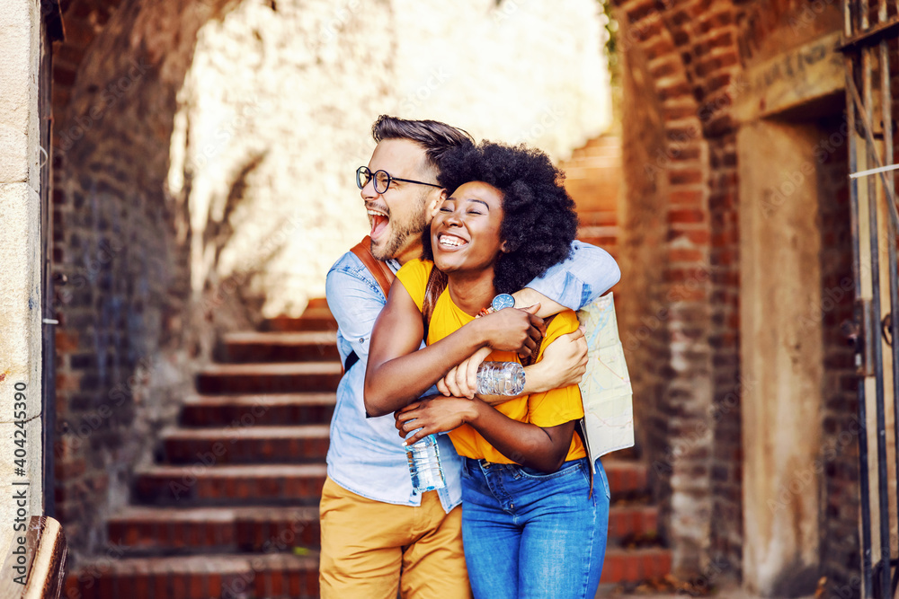 Young attractive multicultural hipster couple in love hugging and in an old part of the city. Man holding a map. Tourism concept.