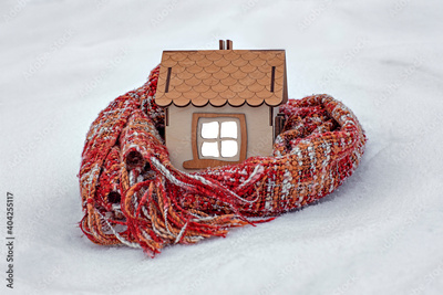 a wooden house in the snow in winter, a knitted scarf around the house, the concept of insulation and heating, protection of the house from winter cold,