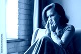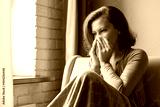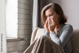 Sick brunette woman sneezing in a tissue sitting on the couch in the living room near window