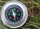 round compass on background of summer grass as symbol of tourism with compass, travel with compass and outdoor activities with compass