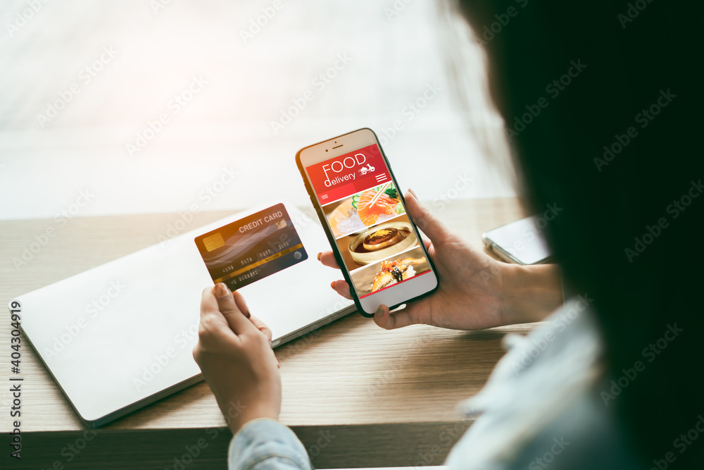 Black view of woman using mobile app to order delivery food and pay whit credit card at home during coronavirus(covid-2019) pandemic.