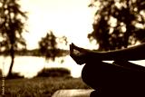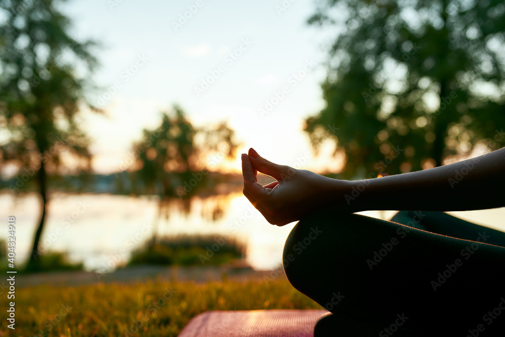 Meditation. Cropped shot of a woman doing yoga outdoors near lake or river at sunset, sitting in lotus pose on the background of nature