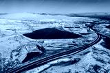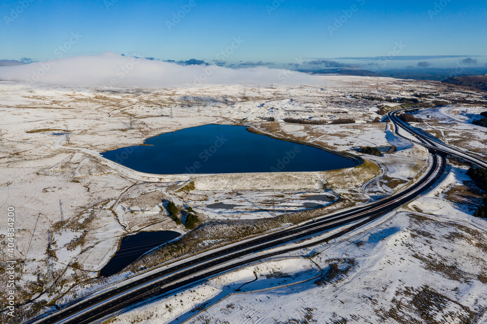 Aerial view of a large reservoir next to a major dual carriageway on a snowy day
