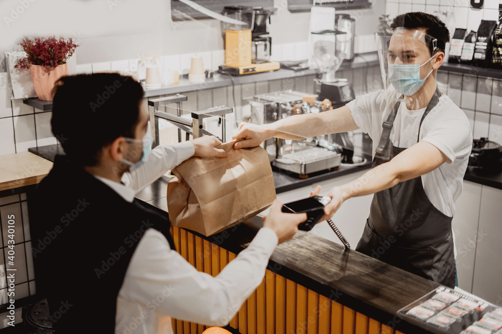 Buys food in a paper takeaway bag with a customer. A gadget for paying in a restaurant. The phone in his hands for purchase in the shop. online payment.