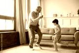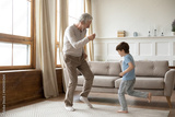 Excited elderly grandfather have fun dance with little preschooler grandson in living room at home. Overjoyed mature granddad enjoy family weekend listen to music with small 6s boy child.