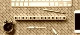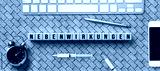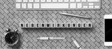 cubes with German message for SIDE EFFECTS surrounded by syringes and smartphone and keyboard on stone pavement background