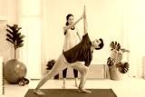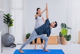 Asian young couple exercise and play yoga together at home background.Concept of Exercise during the quarantine at home for preventing coronavirus and covid-19 infection.