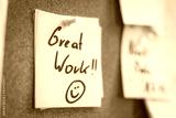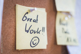 Employee motivation and leadership concept. “Great work” note on pinned paper, cork board