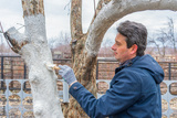 Whitewashing of fruit trees in spring garden. Human hands in gloves holding brush and whitewash bucket close-up. Man gardener whitening trunk of apple tree. Spring work in garden, gardening concept