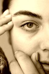 Large portrait of a beautiful young woman with a half-covered face with a cloth