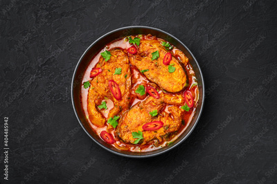 Macher Jhol in black bowl on dark slate table top. Indian cuisine Bengali Fish Curry. Asian food and meal. Top view