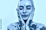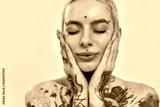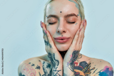 Tattoo and piercing. A close up of a white tattooed woman pierced with her eyes closed and palms over her cheeks