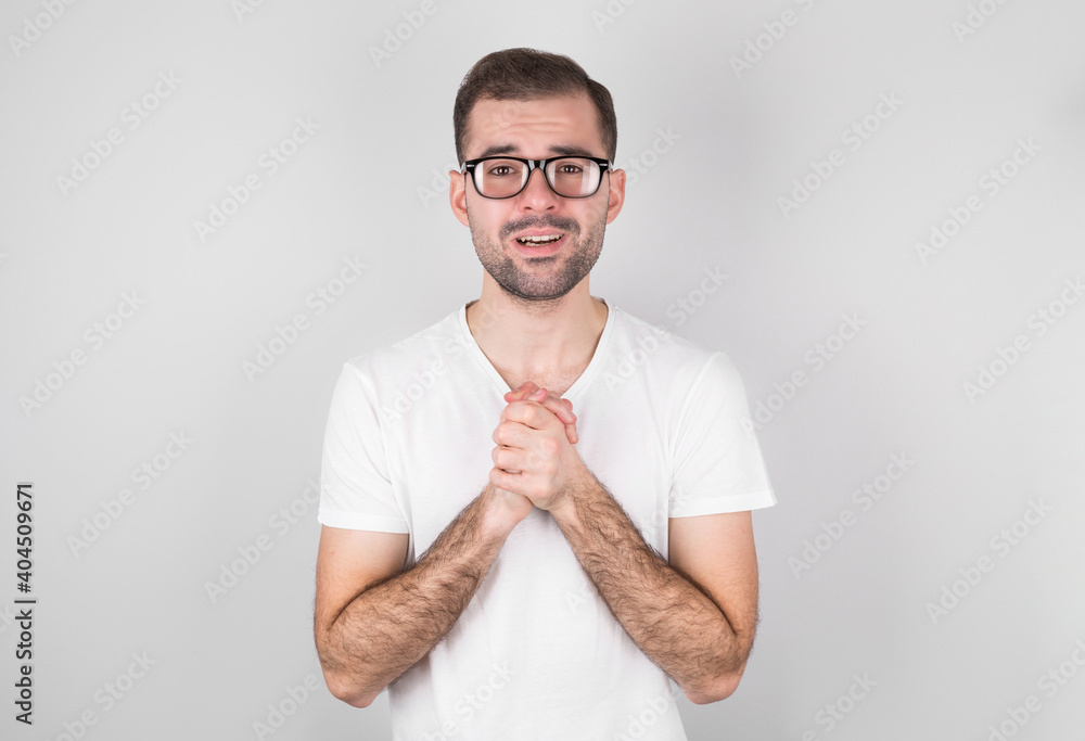 a man in a white T-shirt on a gray background makes a wish for his birthday.