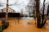 Ecological catastrophy. The stream of a dirty brown river flows along the ground in a holiday village. The holiday village is buried in a muddy mudflow.