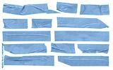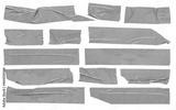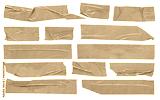 Beige adhesive tape, set of crumpled torn pieces of sticky brown tape on white background