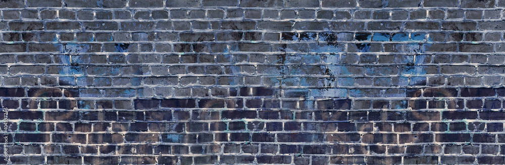 Distressed Painted Brick Wall Background Isolated. Blue Urban City Texture Material. Graffiti Painting Covered With Paint. High Resolution Banner.