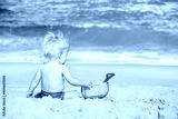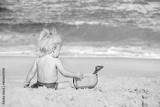 Cute happy blond boy play with small bucket hold shovel on the beach near the sea view from back