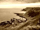 Atlantic coast, Northern Ireland, UK. Cliffs with geological strata and far view Giant’s Causeway, unique natural geological formations of volcanic basalt rocks, resembling cobblestones