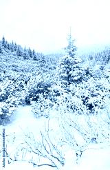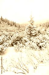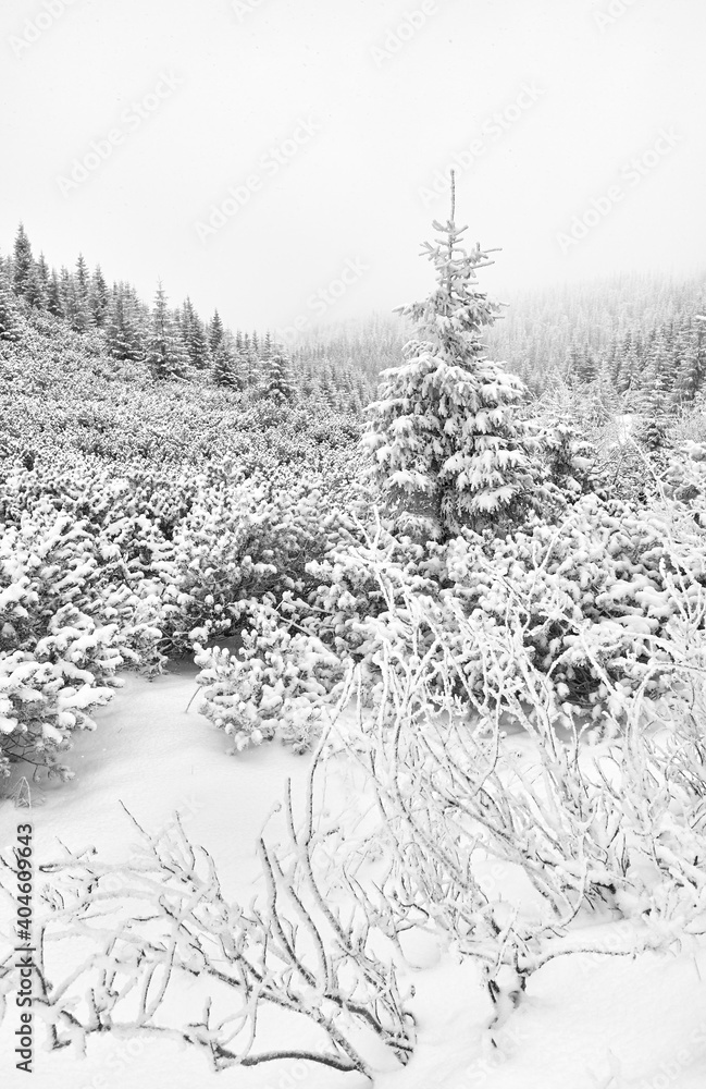 Black and white picture of a mountain landscape during heavy snowfall.