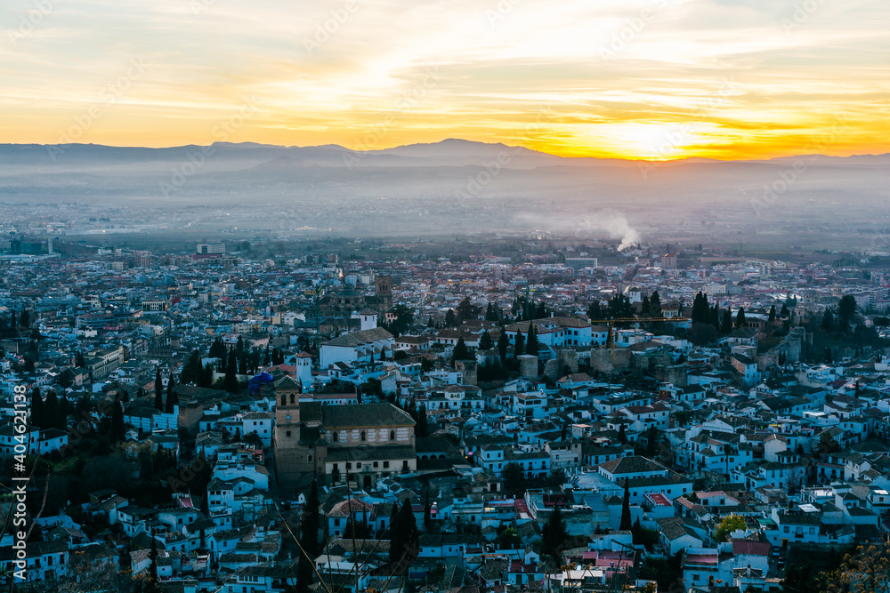 Alhambra palace in Granada at sunset from San Miguel lookout